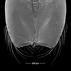 The bottom end of the chelicerae of Pholcus phalangioides, viewed from the side nearest the mouthparts. Note the absence of cheliceral teeth.