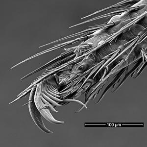 Tarsal claw of Pholcus phalangioides. The central claw and serrated bristles, characteristic of web dwellers, can be seen clearly.